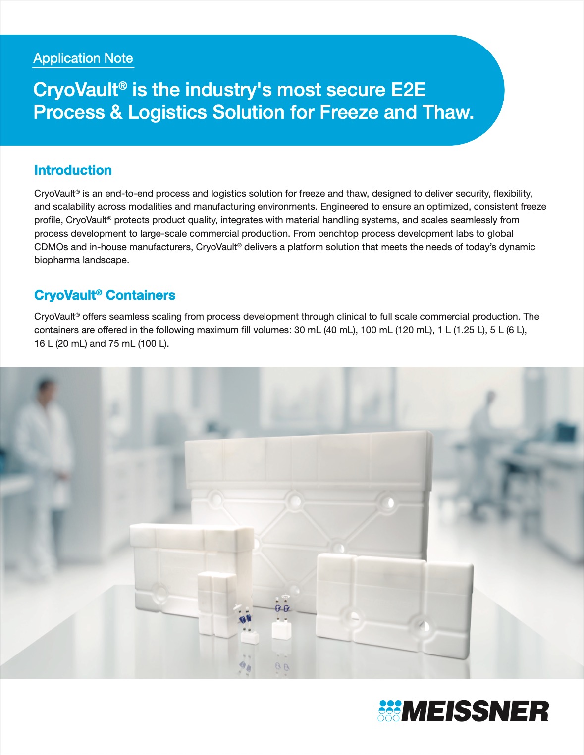 Scalable Volumes: From stability containers with fill volumes of 30 mL and 100 mL and large scale containers with working volumes up to 75 L, CryoVault® delivers consistent performance from bench top to pilot to commercial scale.