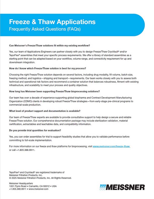 Meissner is the industry’s premier choice for critical freeze and thaw operations, delivering unmatched security and performance at every scale. Whether you’re working with small process development (PD) volumes or full commercial scale production, Meissner provides the most secure platforms on the market—removing risk at every processing step from fill and freeze to thaw and dispense. Count on our team of seasoned experts to help you optimize your freeze-thaw operations so you can focus on the delivery of medicines to the patients who count on you.